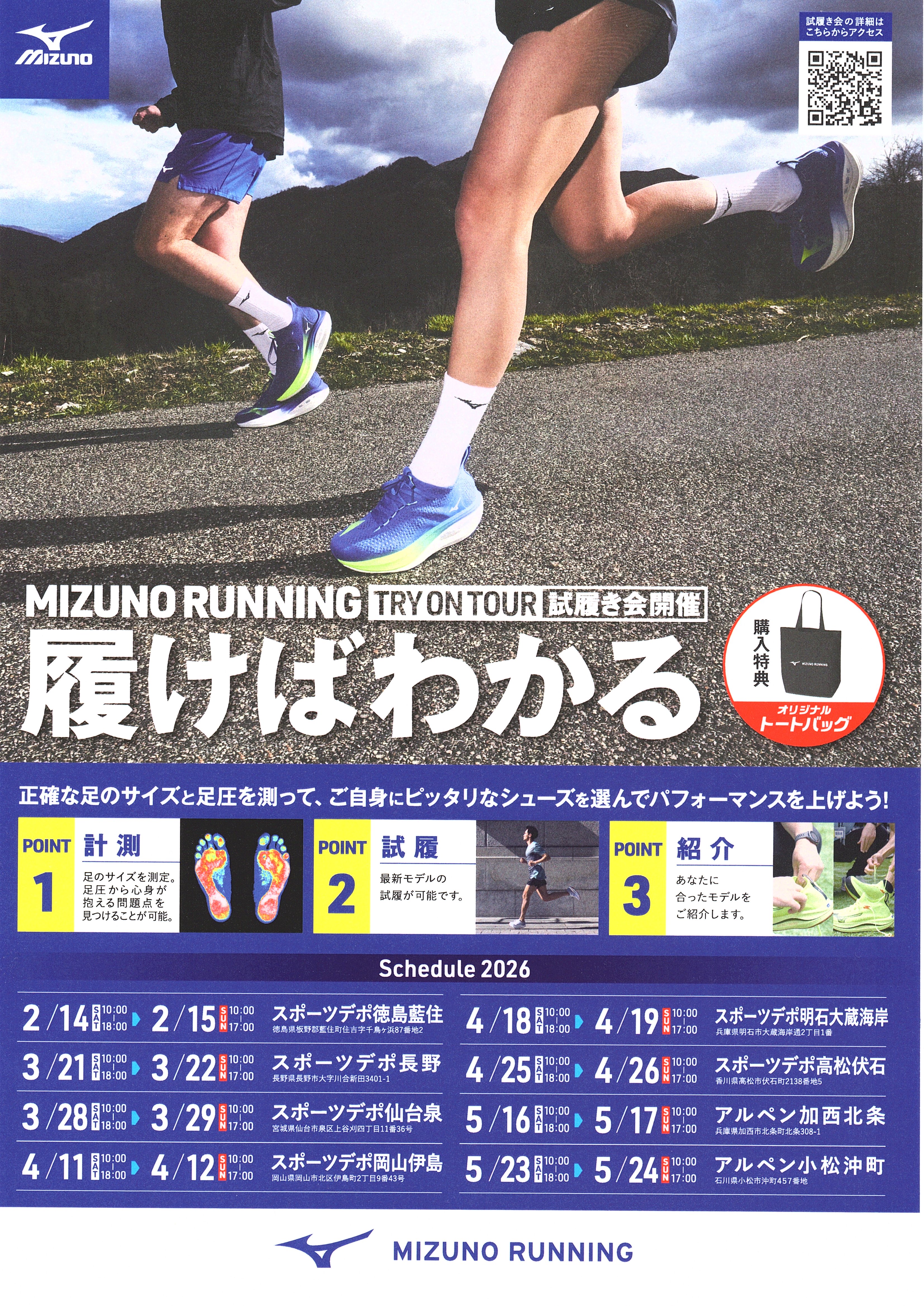 - 当協会へのご支援、ご協賛をいただいております「スポーツデポ様」から店舗イベントのご案内です。ミズノ社様による足サイズ測定などシューズ購入特典のご案内です。3月28日、29日の両日開催されますので大会の合間をみてご参加ください。チラシ右上部のQRコードからお申し込みください。